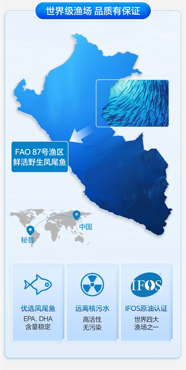 原料来源:选择来自深海小型鱼类的鱼油,如秘鲁、挪威的沙丁鱼、凤尾鱼等。这些鱼类处于食物链底层,重金属积累少,污染风险低。