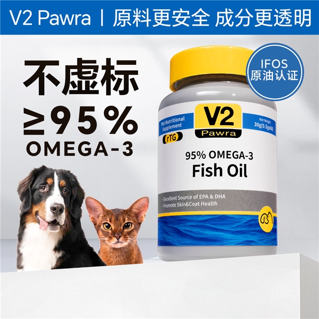 如果对剂量有精确要求,比如幼猫幼犬或老年犬猫等,可以选用V2 Pawra鱼油软胶囊等高浓缩的胶囊形态鱼油进行喂食更好。